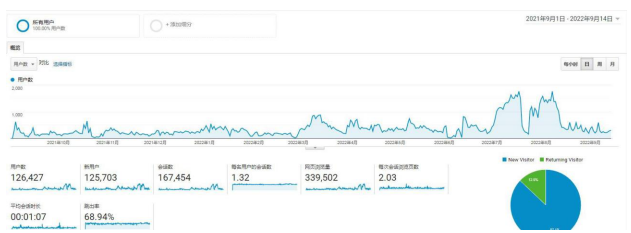 另外在2021年9月—2022年9月这一周期内,网站用户数达到了126427,会话数167454,网站浏览量339502,这组数据说明通过对网站的持续优化,杜高集团的网站咨询量和转化量目前已取得了可喜的成绩。