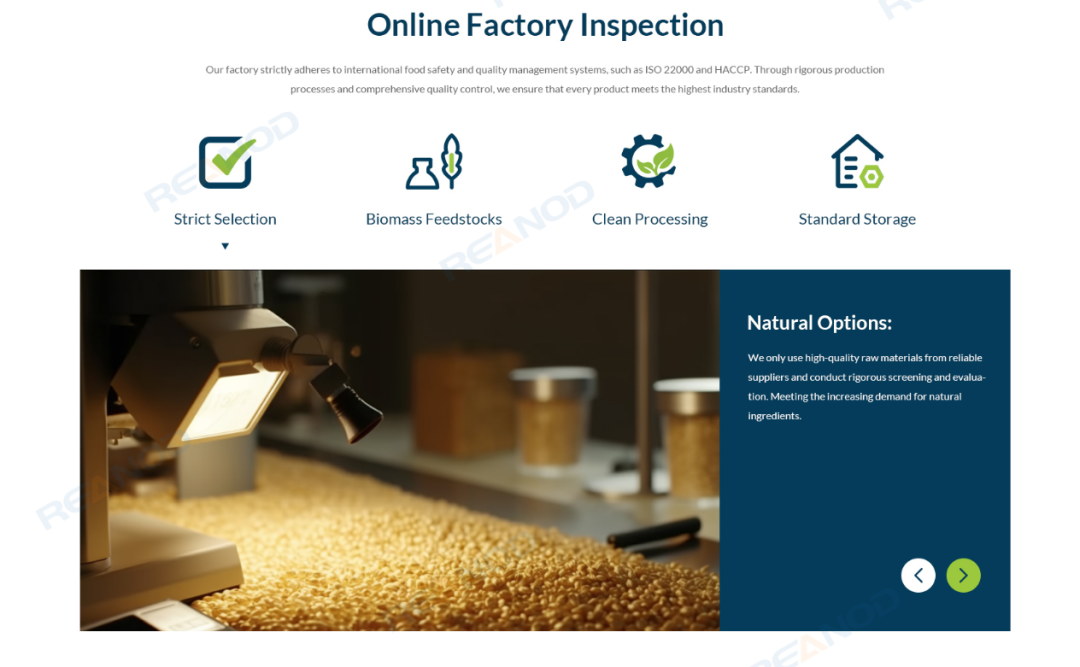 下一幕,蓝绿交汇,开始介绍“质量管理”。用设计来突出行业标准的流程和控制措施,跟随故事的节奏,让采购商在点击之间,跟随故事的节奏,慢慢把“品牌=放心”写进潜意识。